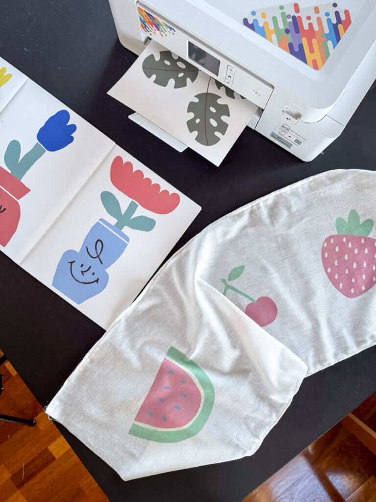 Og så har jeg fået mulighed for at lege med den helt nye sublimationsprinter: SP1 og den er jeg allerede ret begejstret for. SP1 hænger sammen med Artspira-appen (lige som broderimaskinen Skitch PP1), så man kan hente motiver direkte i appen, som så kan printes på SP1. Derefter skal man bruge en varmepresse til at trykke det udprintede direkte på stoffet. SP1 anbefaler, at man trykker på kunststof for at få de klareste print, men jeg har fundet en stofrest i 65% bomuld og 35% polyester, og det kan man altså også snildt printe på.