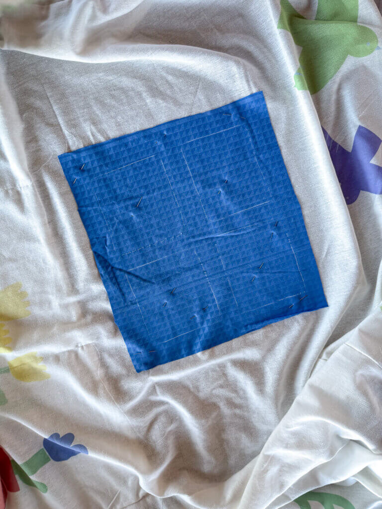 Med nåle sættes bagstykkets side + top + side fast til mellemstykket. Stoffet ligges ret mod ret. Sørg for at sætte nok nåle ved hjørnerne.