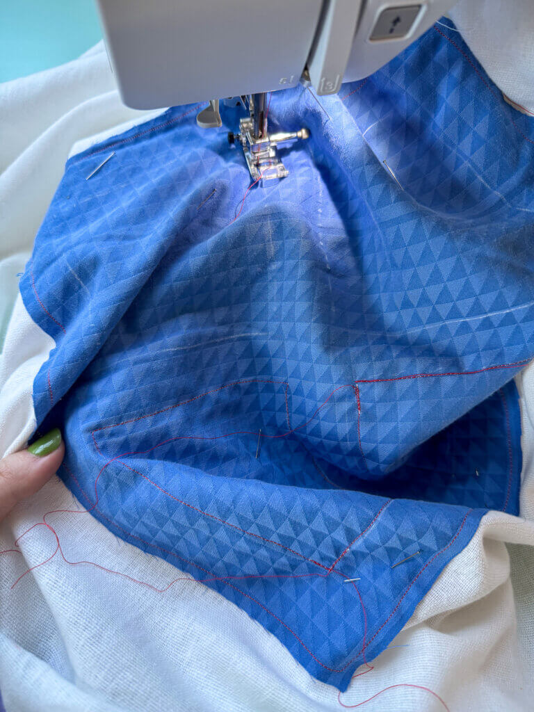 Sy med 1 cm sømrum rundt langs alle tre sider. Man kan med fordel løfte trykfoden (med nålen i stoffet) ved hjørnerne.
