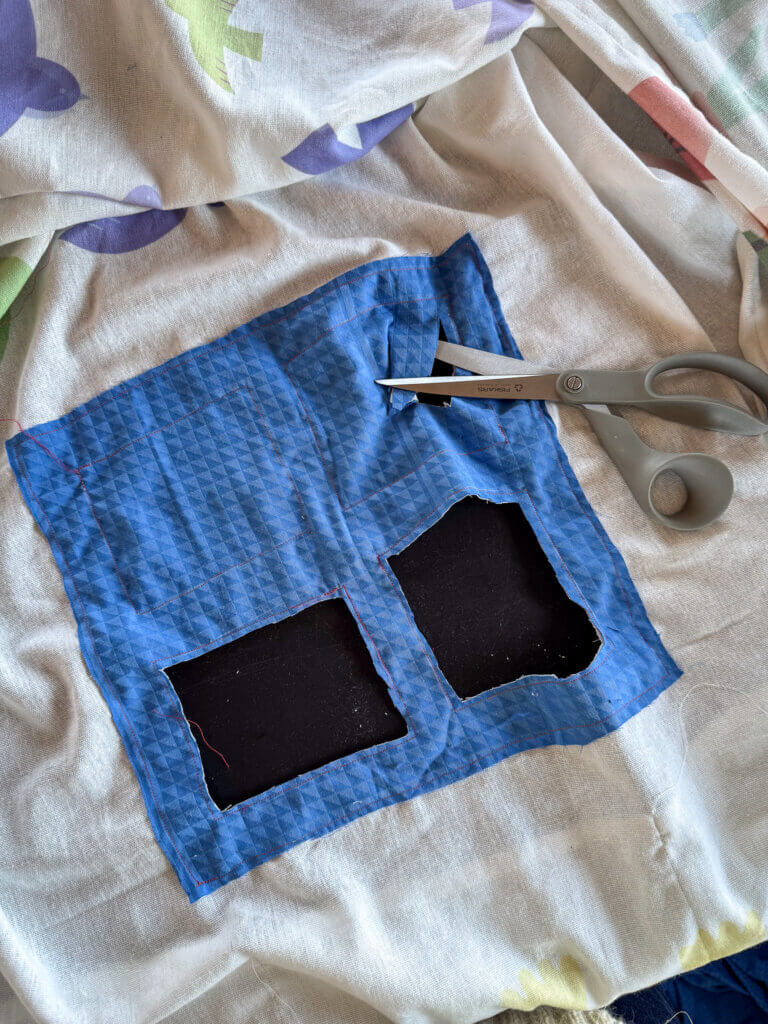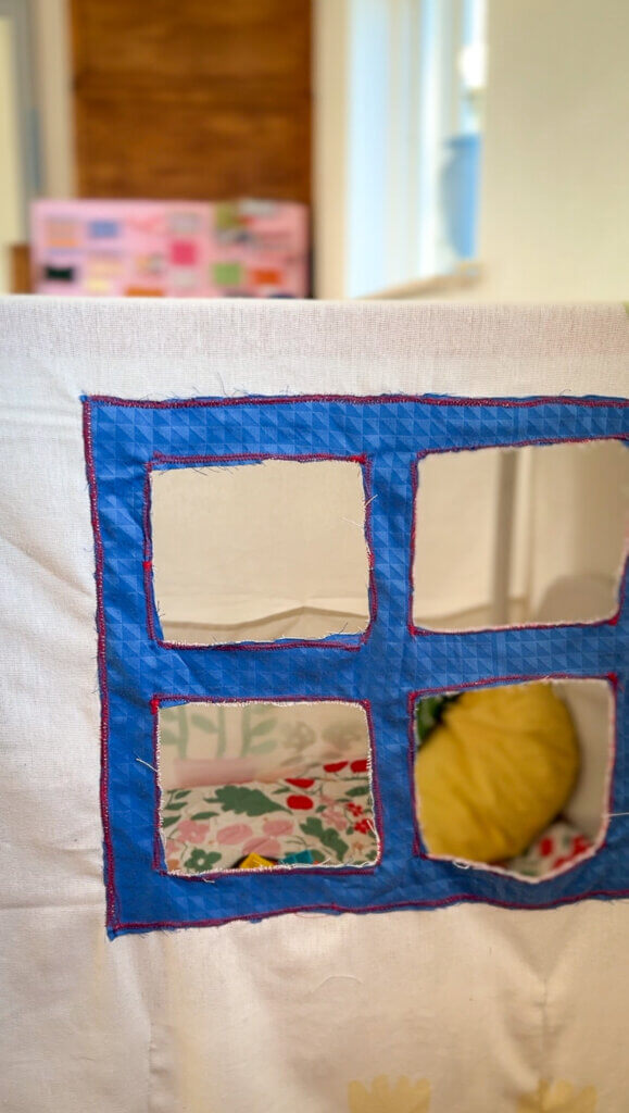 Hvis du ønsker at sy et vindue i, kan du følge guiden herunder. Der er helt sikkert mere professionelle måder at gøre det på – men det her er ret simpelt og fungerer fint til en legehule 😍