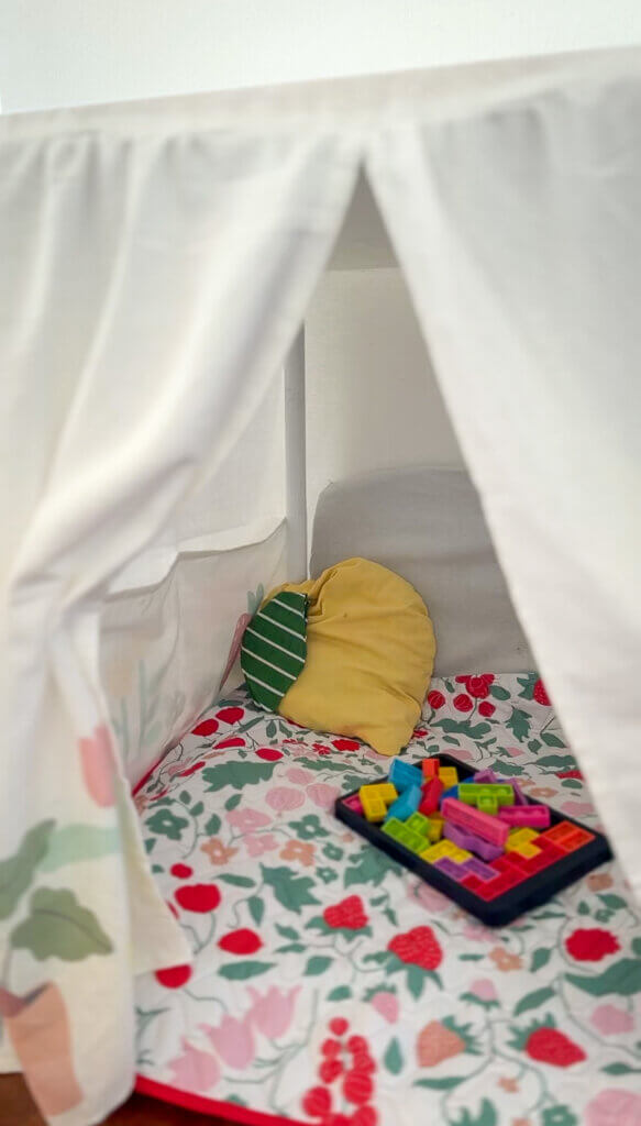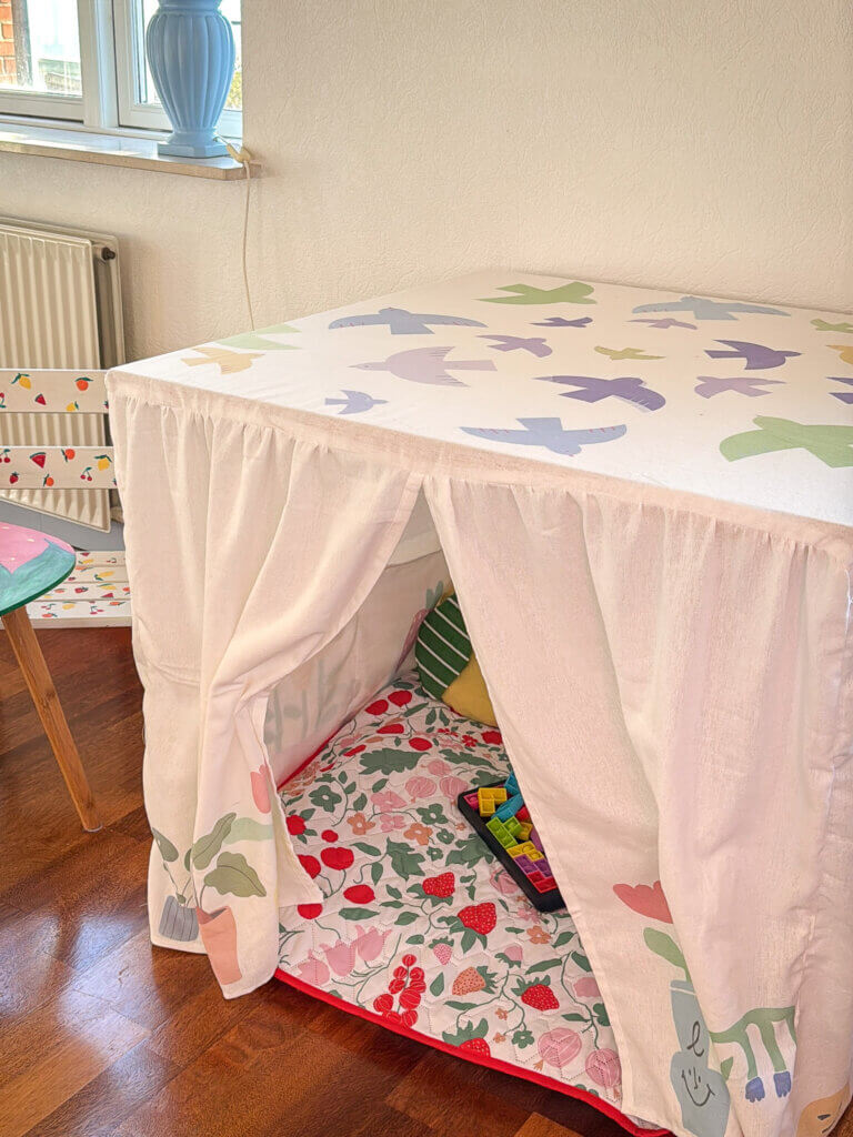 Jeg har længe drømt om at sy en hule til min datter. Jeg har fundet et gammelt skrivebord, som danner basen og så har jeg syet et “betræk”, som nemt kan tages af og på. Man kan også sagtens sy til sit spisebord eller lignende. I dette blogindlæg har jeg skrevet ned, hvad jeg trin for trin har gjort for at sy hulen med vindue og døråbning.