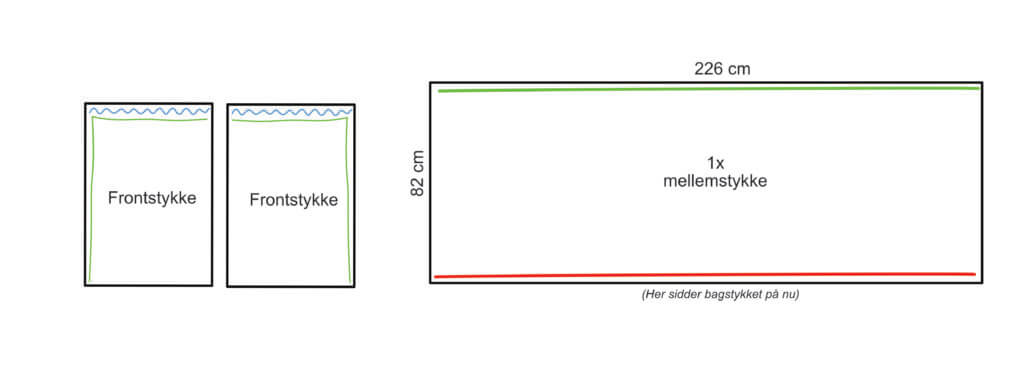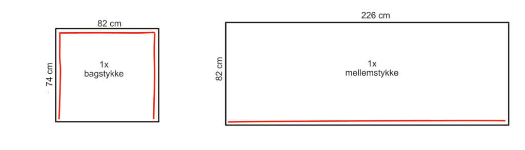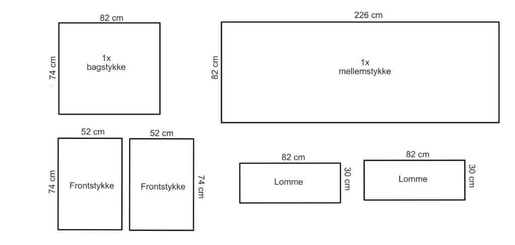 I dette tilfælde klipper jeg to stykker á 74 cm x 52 cm. Jeg ønsker at lave gardin-effekt på frontstykkerne og derfor er den samlede bredde på de to stykker (52 + 52 cm) bredere end bredden på bordet. - 2x lommer til indersiden (hvis det ønskes)