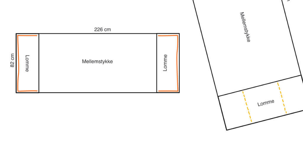 Sy lommen fast på mellemstykket (den orange streg på tegningen herunder), stoffet lægges her vrang mod vrang. Gentag på på den anden lomme i den anden side af mellemstykket.